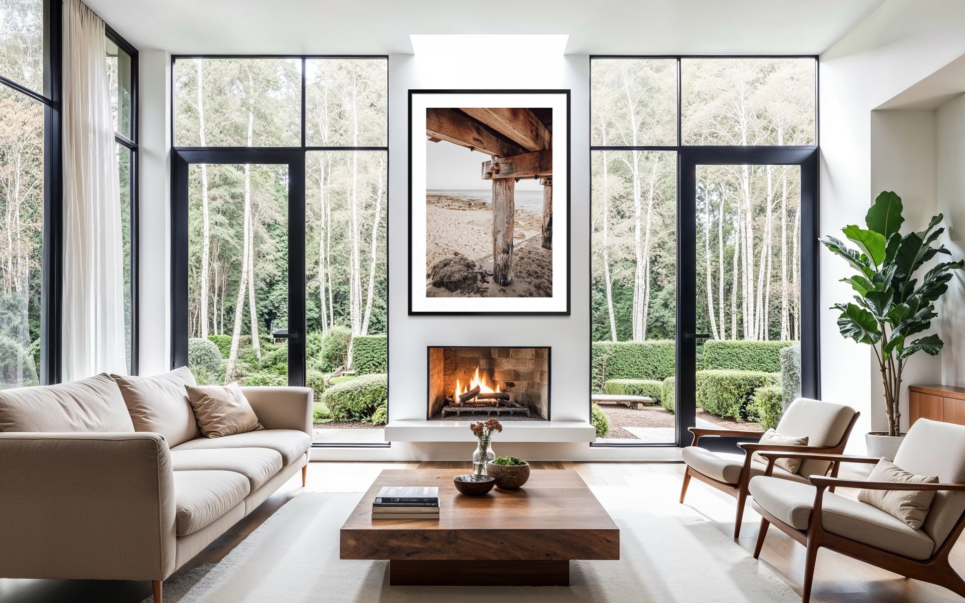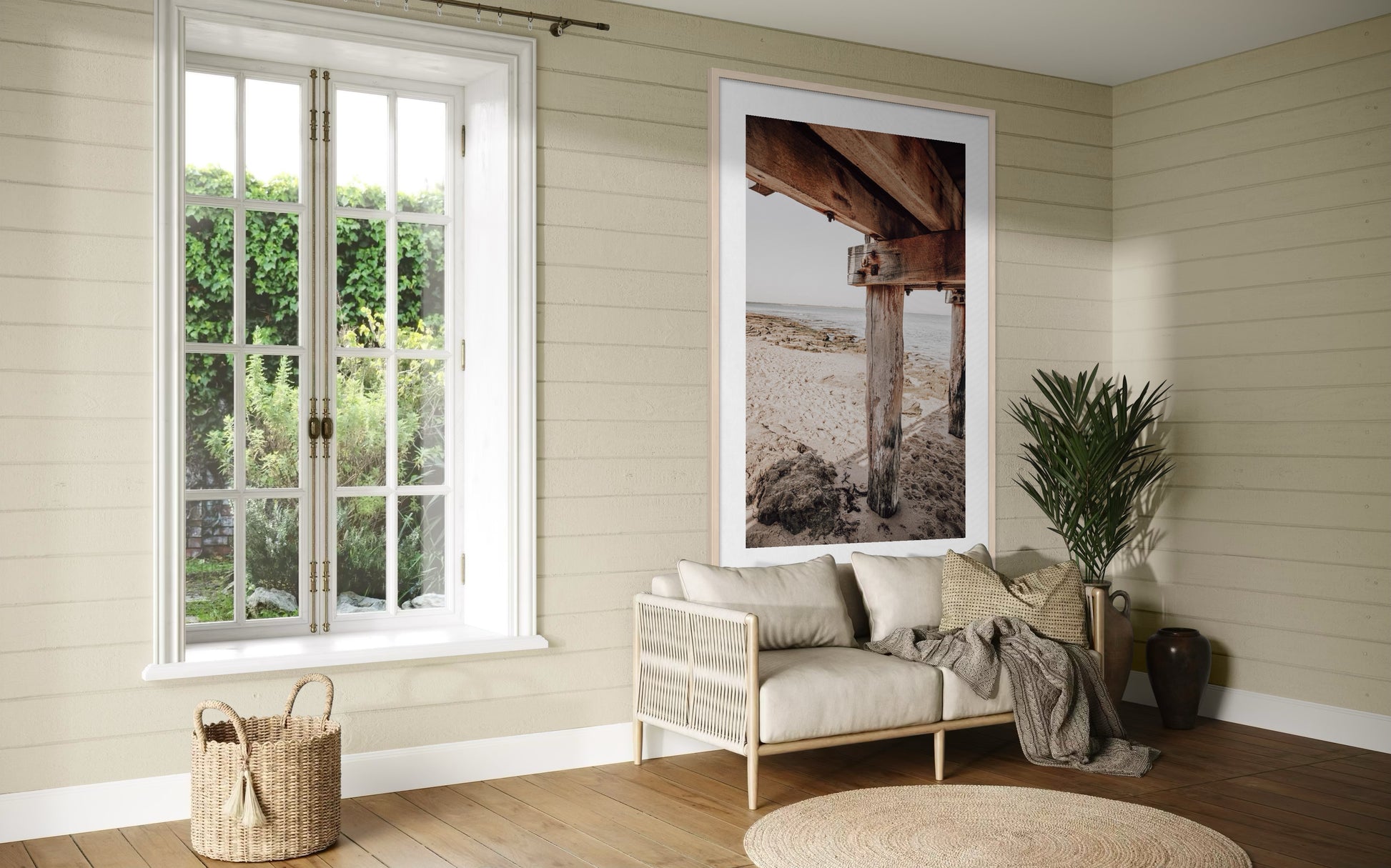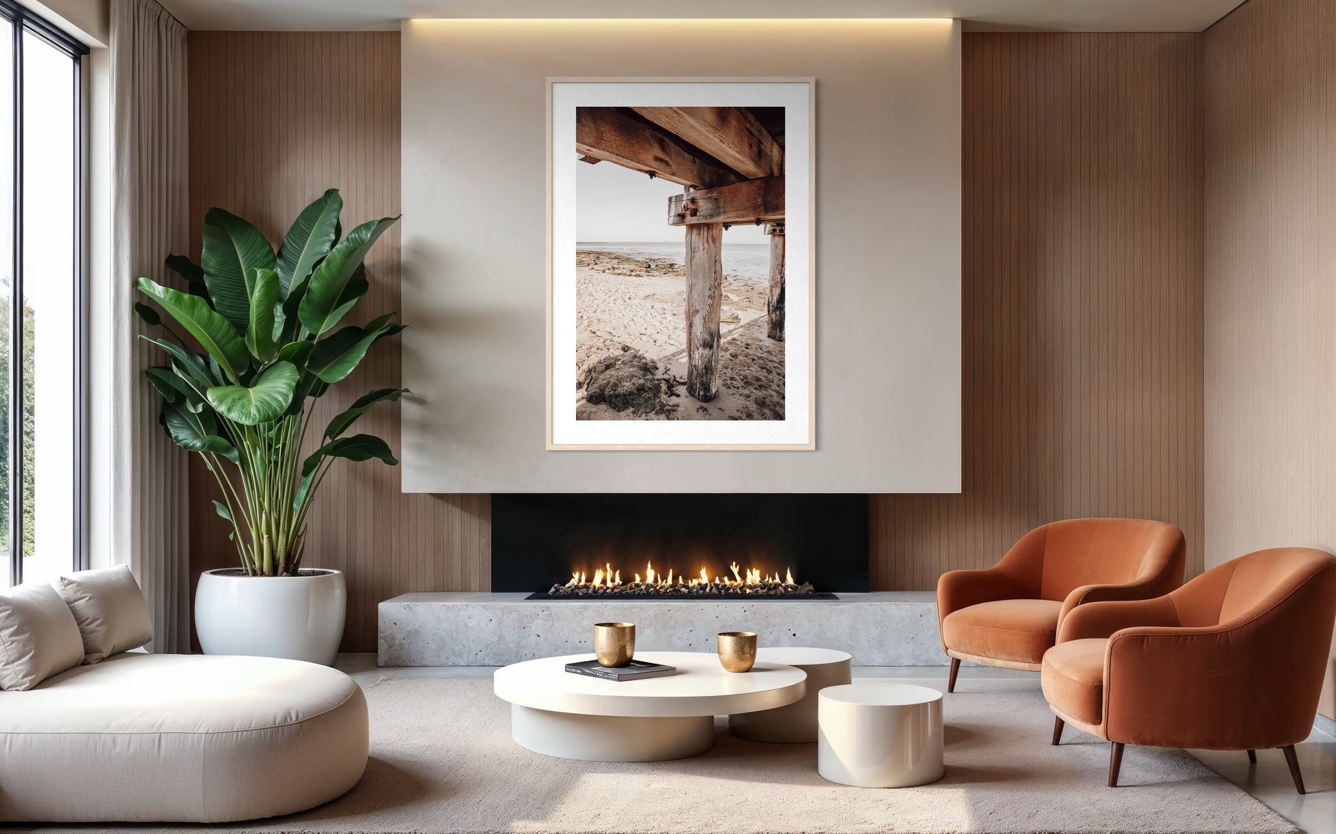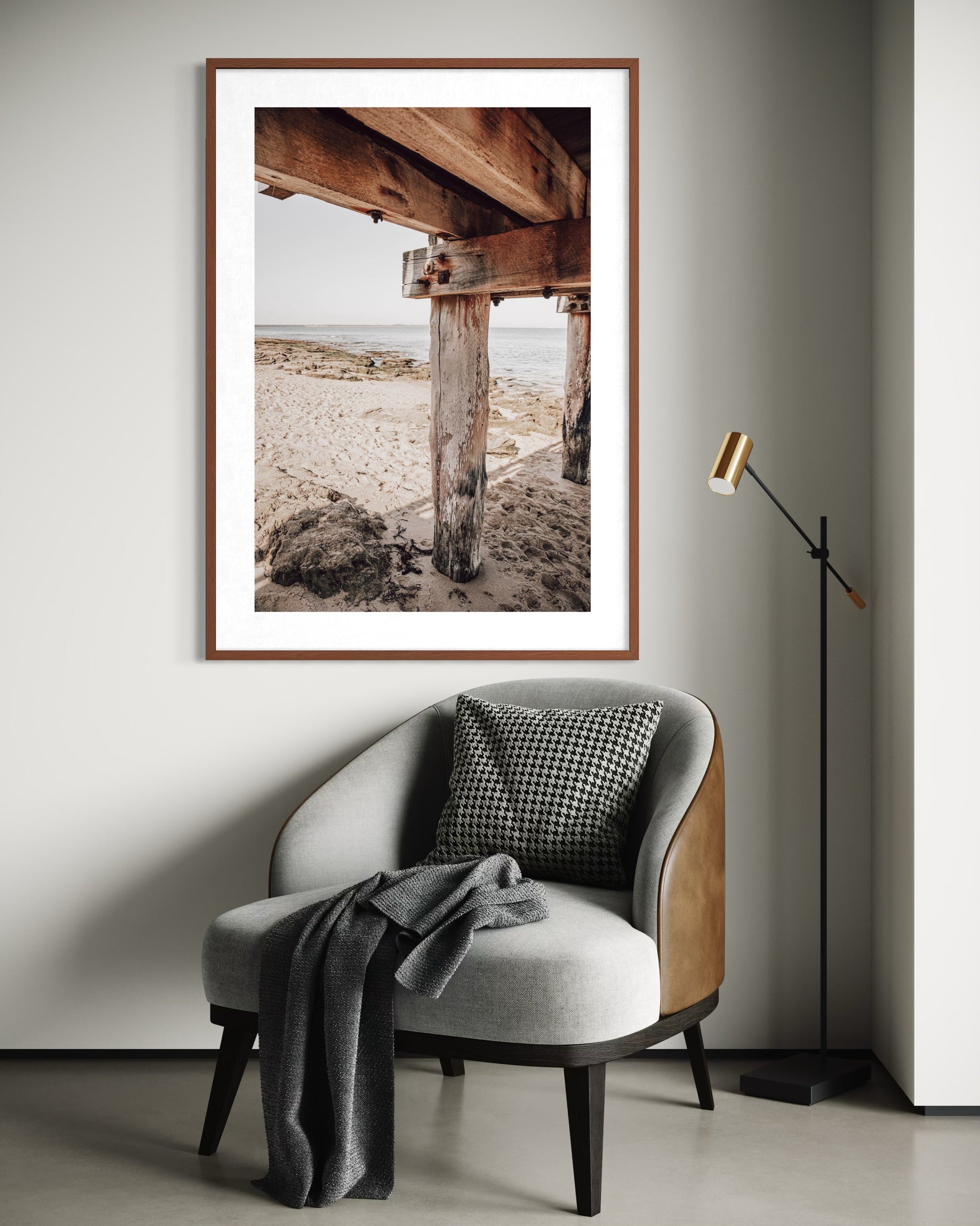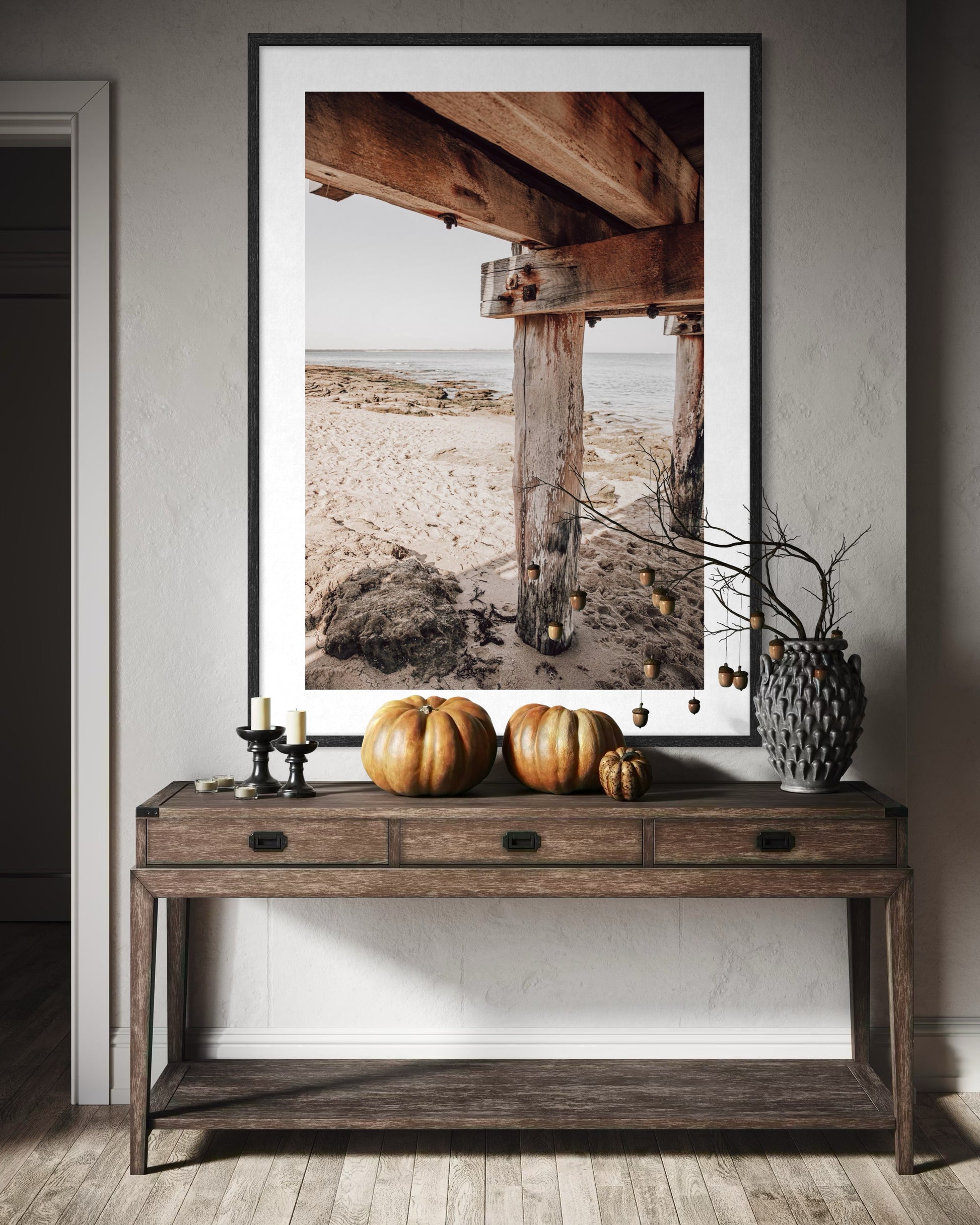 Styling Notes: The warm timber tones, rich textures, and neutral palette work beautifully with coastal, industrial, and contemporary interiors. Pairs perfectly with natural wood finishes, concrete, linen, leather, and earthy tones. The vertical composition and strong architectural lines create visual interest and depth, making it ideal for narrower wall spaces or as part of a gallery wall exploring coastal themes and textures.