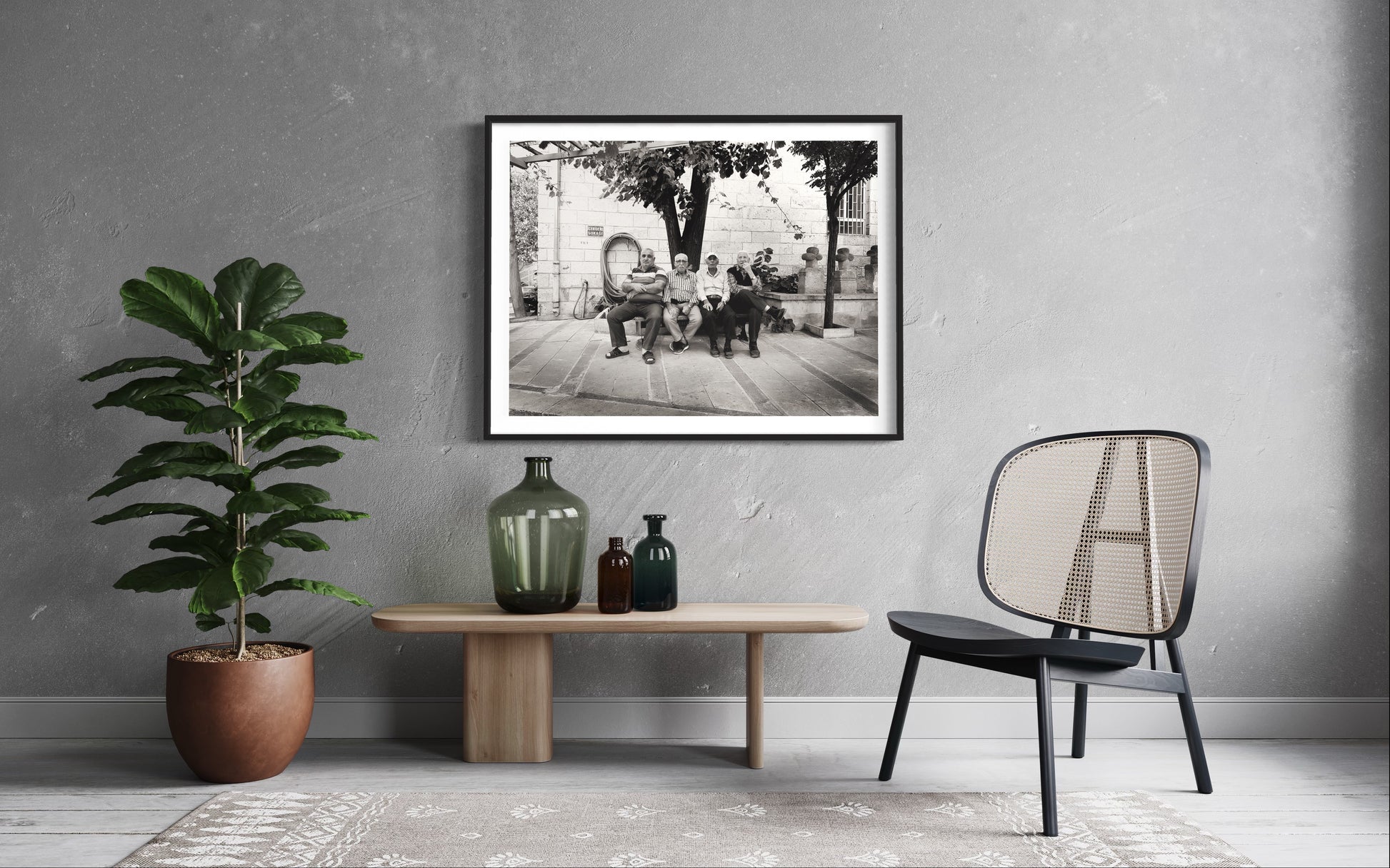 A timeless moment of connection. Captured on the streets of Cappadocia, Turkey in 2019, this evocative black and white photograph reveals four men sharing a quiet afternoon under the shade of a tree – a scene that speaks to the universal language of friendship, community and the simple pleasure of good company.
