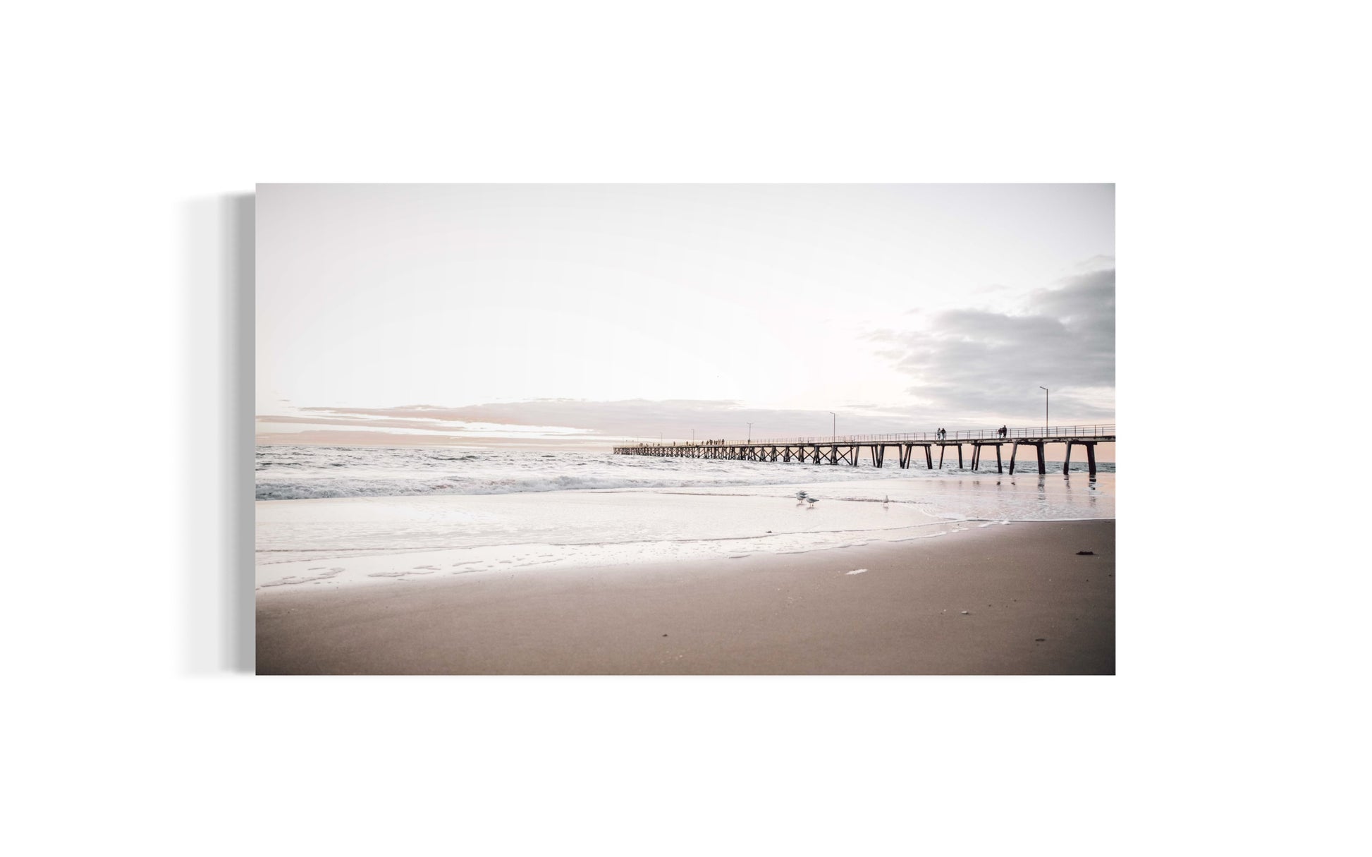 The soft, pastel sky—blushing in delicate pinks, lavenders, and whisper-quiet blues—reflects in the calm waters of the Gulf of St Vincent below, while the rhythmic patterns of the jetty lead your gaze into the distance. The presence of the gulls adds life and movement to this serene coastal scene, reminding us of the simple beauty found in everyday moments by the sea.