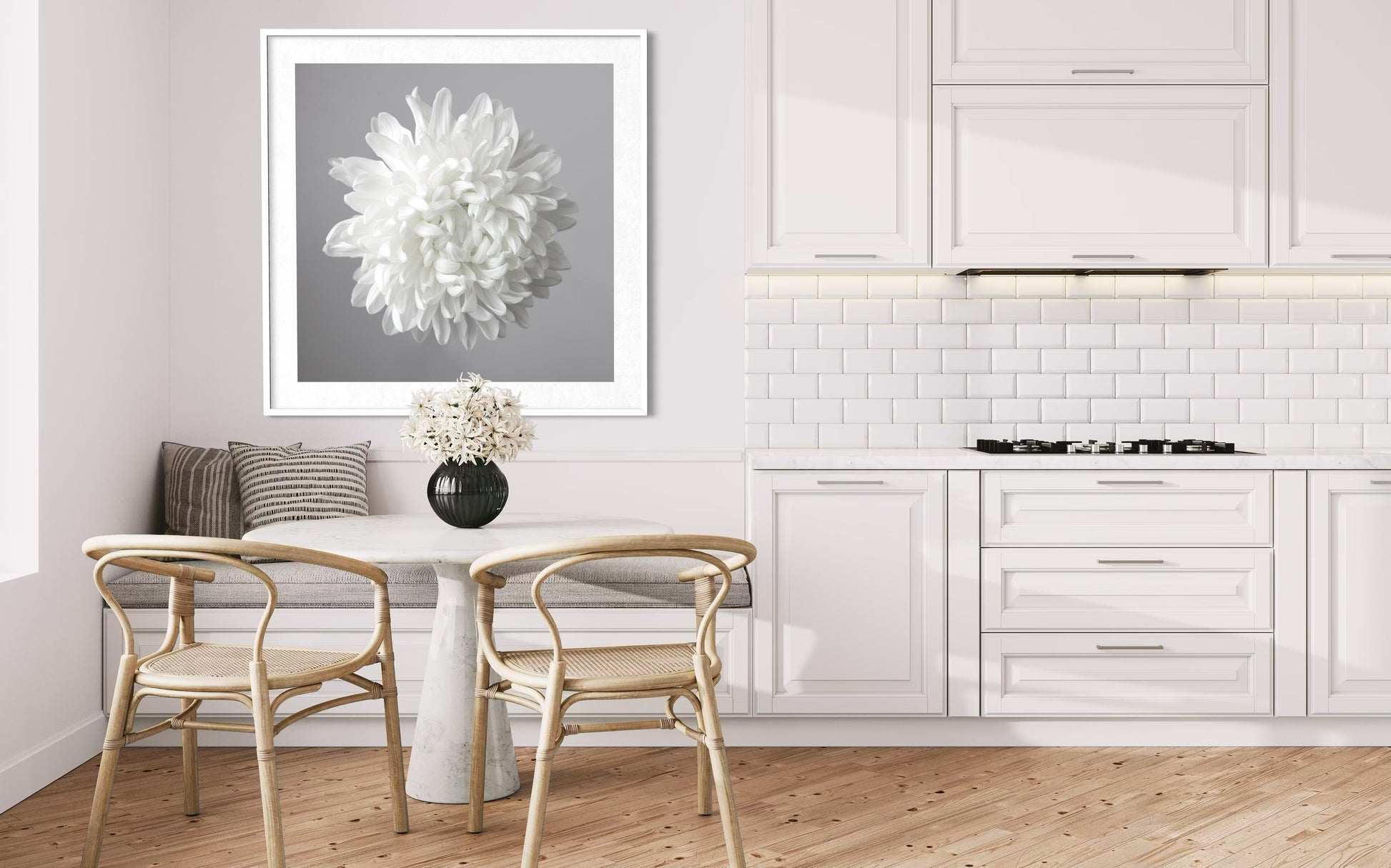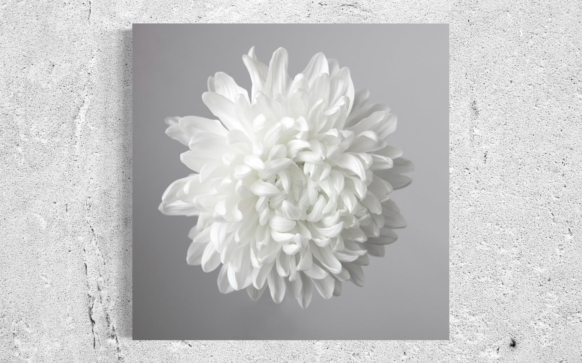 A single bloom against a soft background, this piece celebrates the quiet grace and strength found in simplicity. The closer you look, the more you discover: the subtle texture of each petal, the gentle curves radiating from the center, the timeless elegance of white on white.